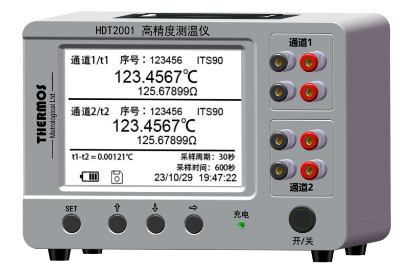 HDT2001型高精度双通道数字测温仪是为了实现计量级所设计的数字显示仪器。它可以最达两个通道同时进行全量程精度高达5mK水平的测量。具备输入电阻范围0~400Ω输入电阻范围,结合ITS90温标、IEC751,HDT2001能做最大范围-200~660℃测试。使用一个5寸液晶屏,能够清晰显示各项测试数据,并方便容易用户配置传感器设置。